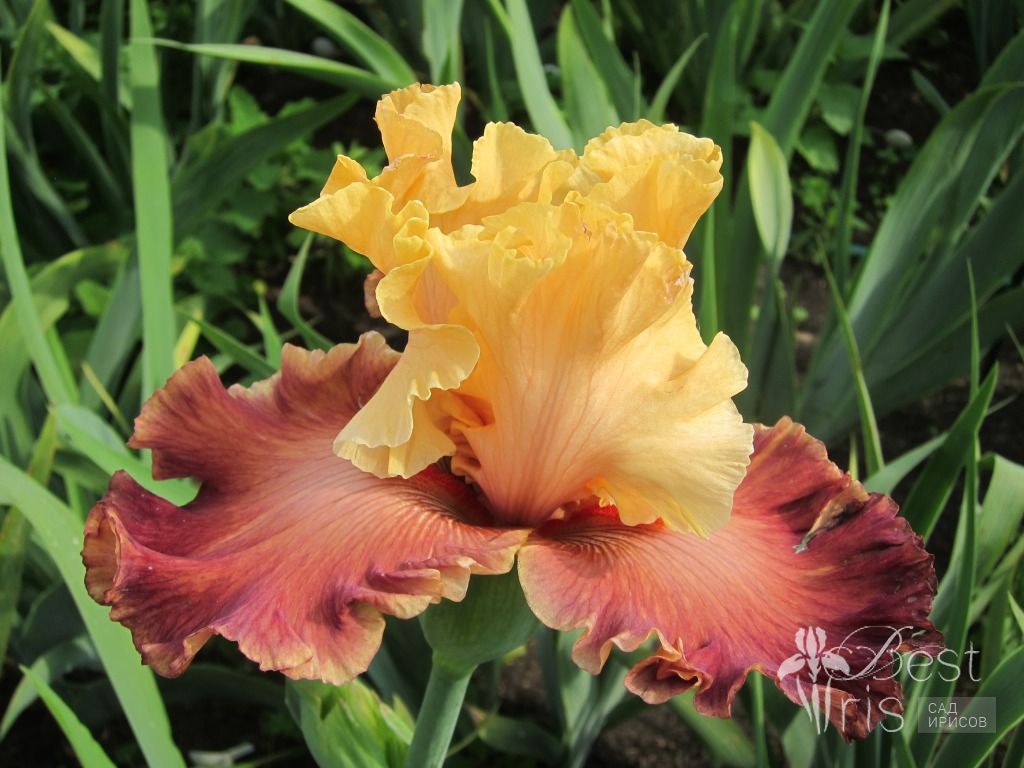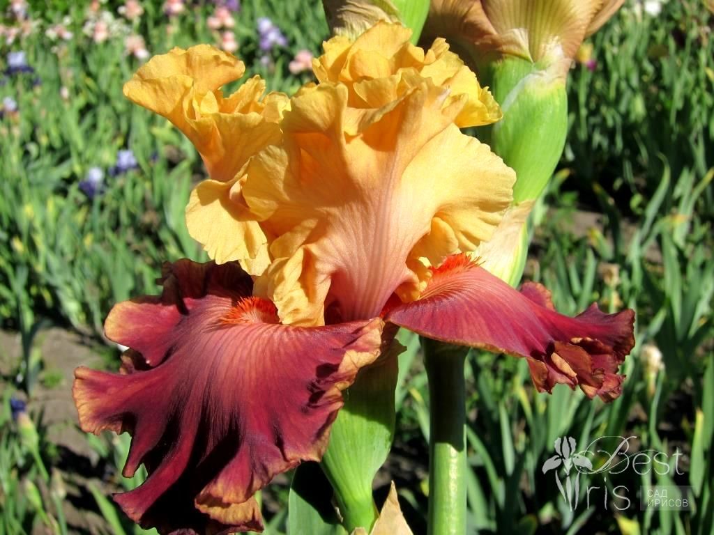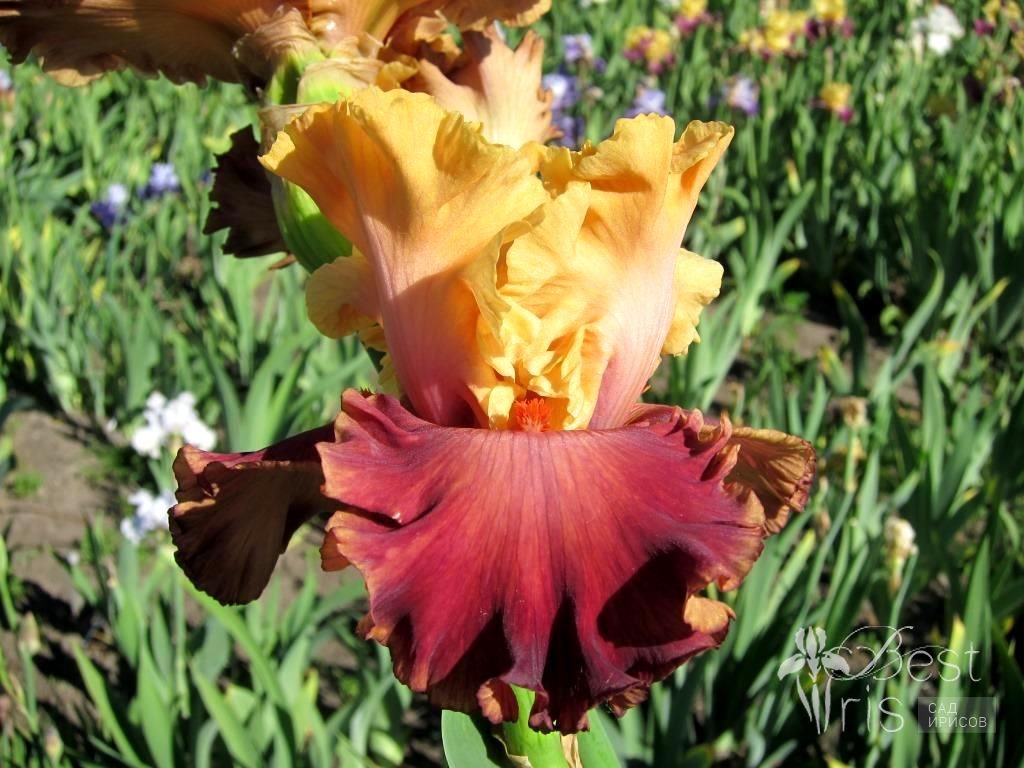 Описание:Blyth’14, ЕМ, 94. Абрикосовые стандарты. Бордовые фолы с хорошей гофрировкой и светлым краем цвета стандартов. Под тёмными мандариновыми бородками светлый сигнал. Яркий, необыкновенно красивый цветок!