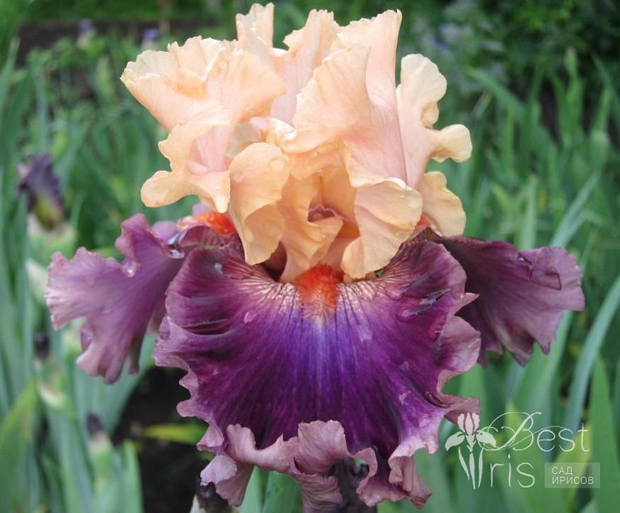 Описание:Johnson’11, M, 86, HM’014. Персиково-розовые стандарты с прекрасным розовым румянцем на спинках. Широкие винно-бордовые фолы с тонкой лавандово-розовой каймой. Яркие оранжевые бородки.Гофрированный. Крупные цветы расположены на сильных, хорошо разветвленных стеблях. Очень красивый цветок!