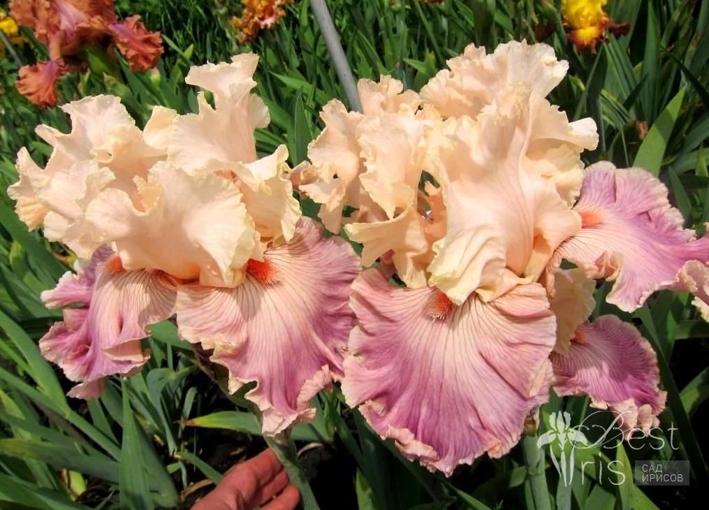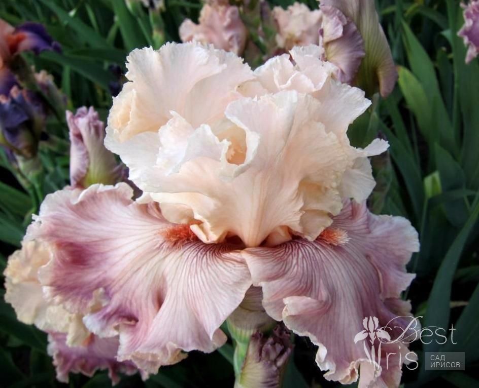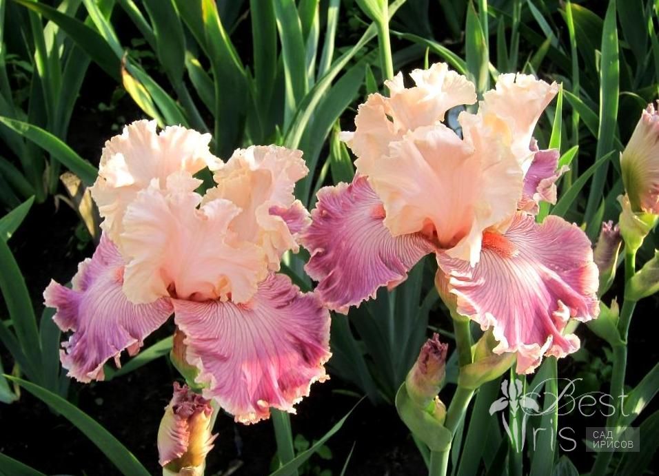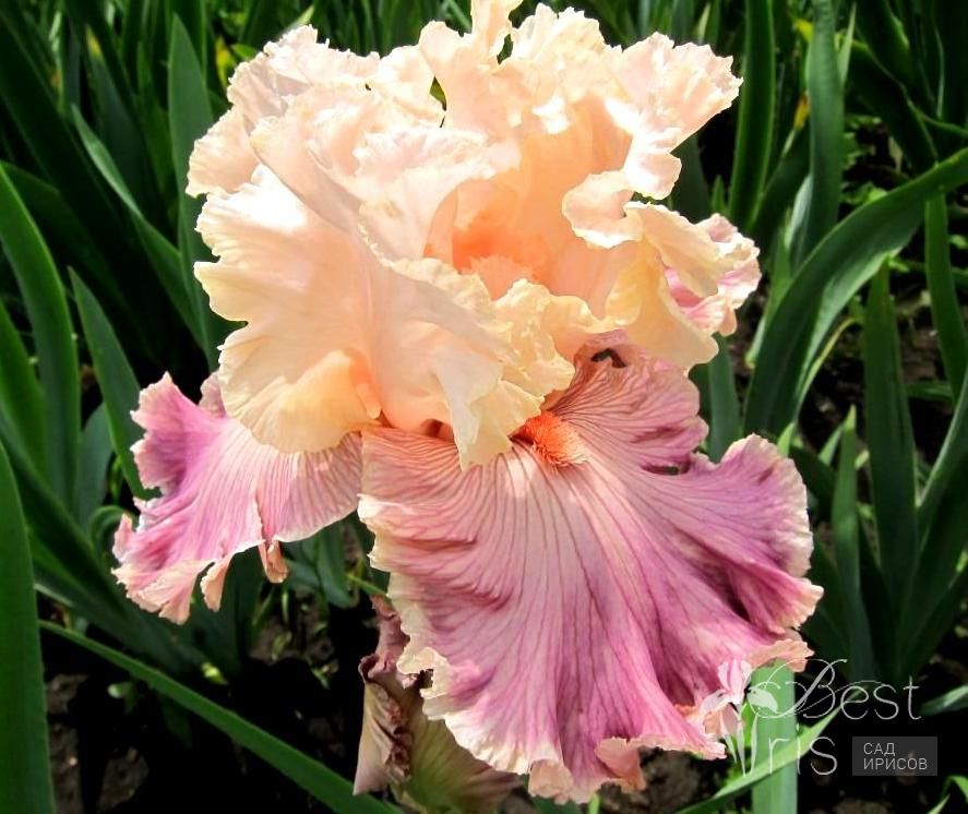 Описание:Blyth’12, ML, 89. Розово-персиковые стандарты. Более тёмные фолы пронизанные тёмно-розовыми венами. По краю окантовка светло-розового цвета. Бородки коралловые на белом. Широкий, гофрированный и необыкновенно красивый!!!