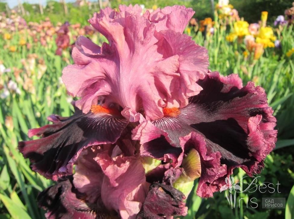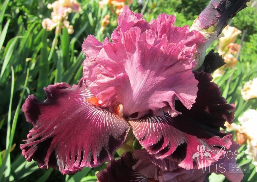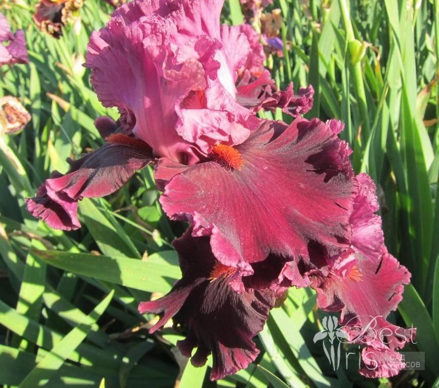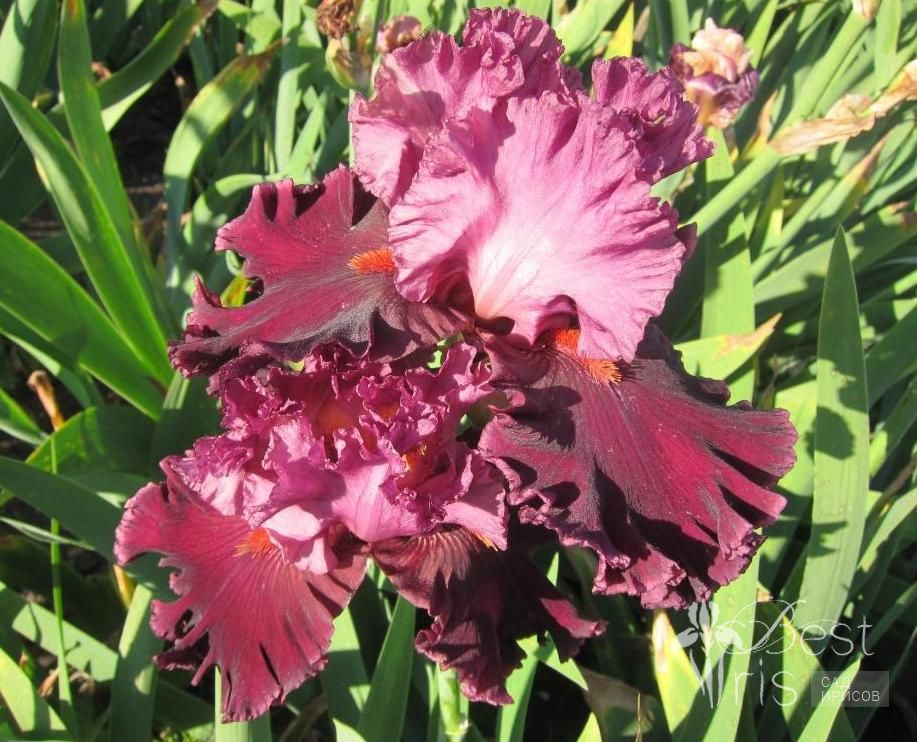 Описание:Johnson’09, EM, 97, HM’11. Тёмно-розовые стандарты. Бархатные тёмно-бордовые фолы с каймой цвета стандартов. Яркие оранжевые бородки акцентируются короткими белыми прожилками на каждой стороне. Шикарная гофрировка, огромные цветы впечатляют!