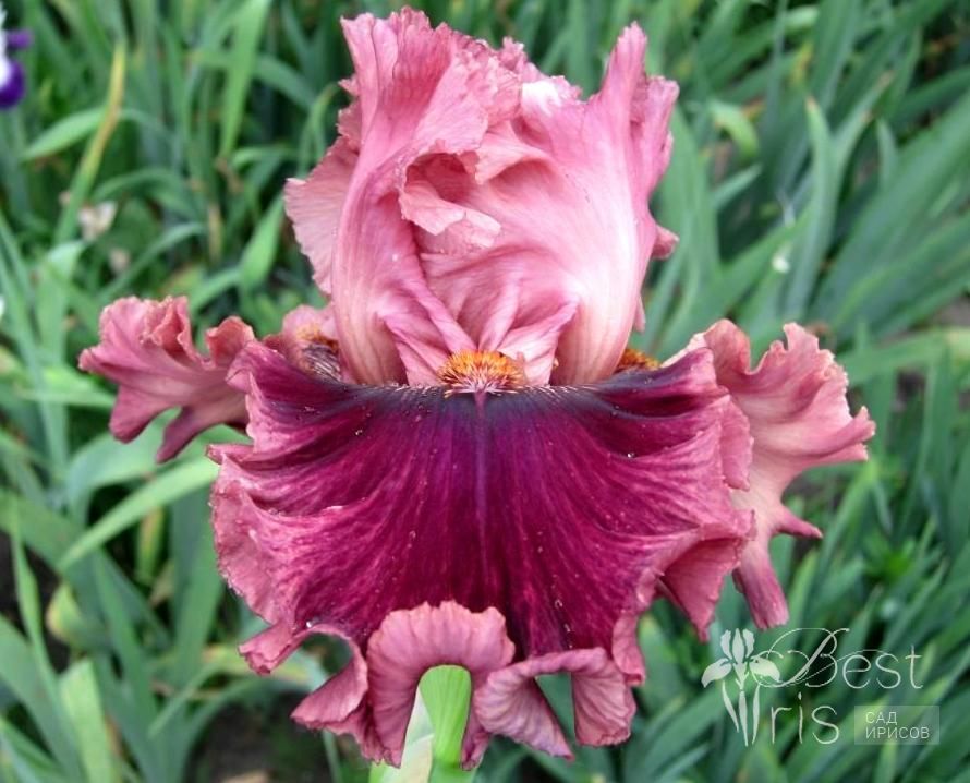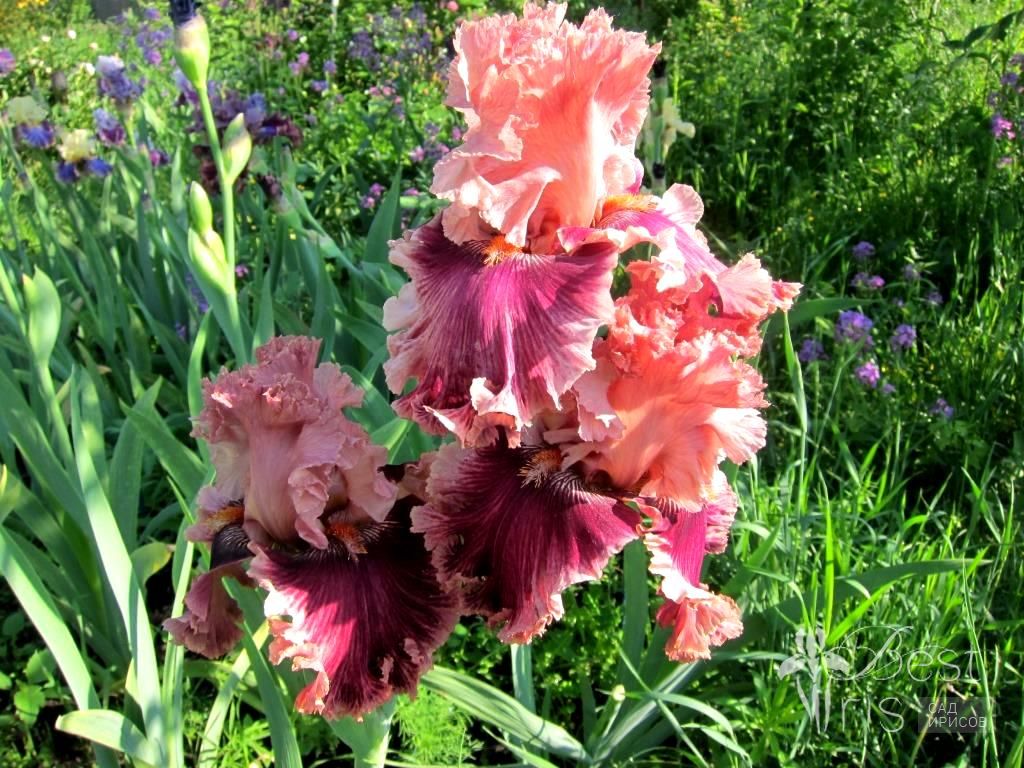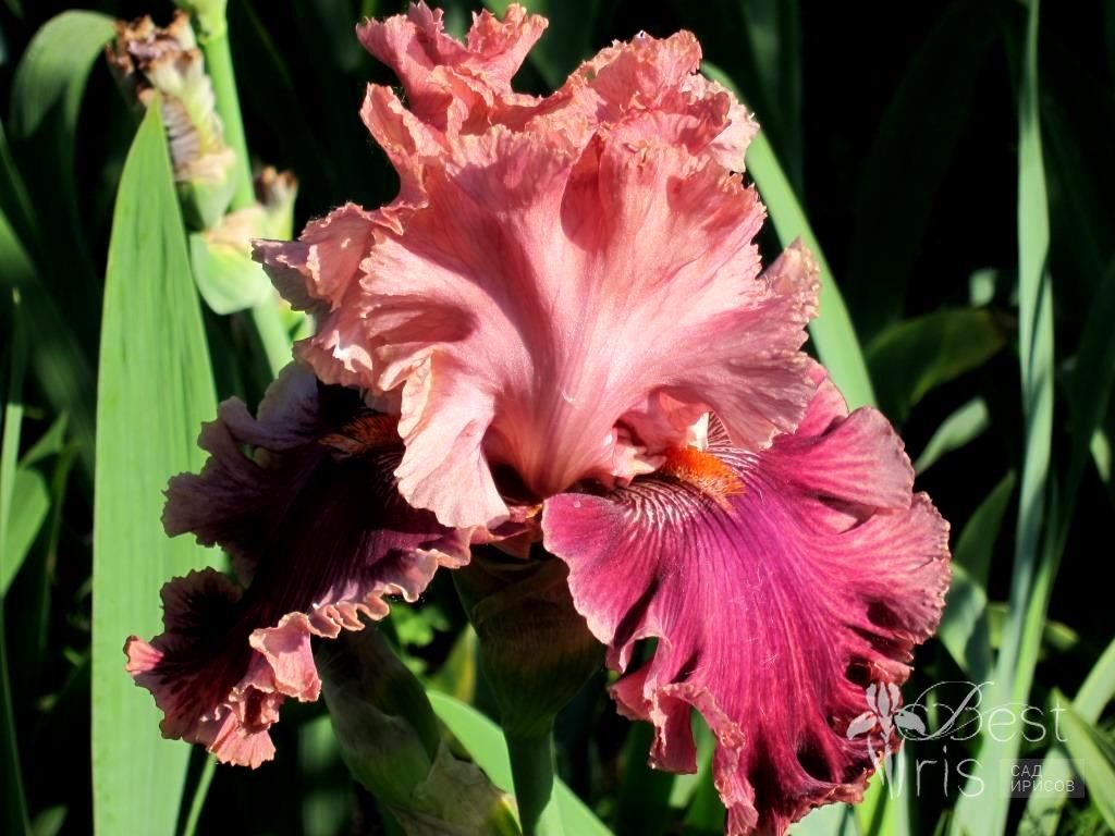 Описание:Blyth’09, ML, 97. Светло-розовые, кружевные стандарты. Розово-вишневые фолы, на концах переходящие в жилкование. По краю широкая кайма цвета стандартов. Бородка-оранжевая. Сладкий аромат. Хорошее ветвление. От прекрасных родителей, сын DECADENCE.