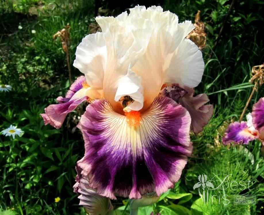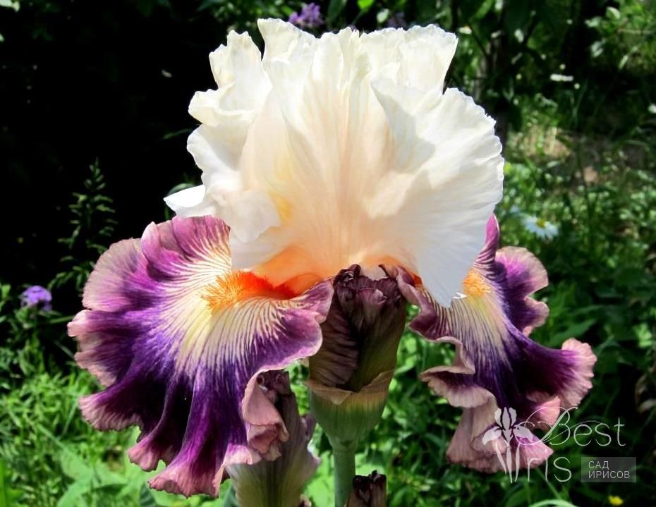 Описание:Ghio’08, EM, 84. Стандарты насыщенно – белые, фолы - фиолетовые с широкой каймой цвета слоновой кости, около мандариновой бородки пятно цвета окантовки фолов, с тонкими фиолетовыми прожилками. Парящий, пузырчатый, гофрированный! Супер цвет и форма! Уникальный!